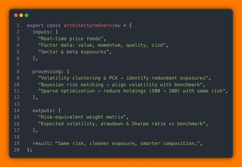 A multi-factor AI system that constructs risk-equivalent portfolios to traditional benchmarks like the S&P 500 — but with optimized composition and fewer holdings.